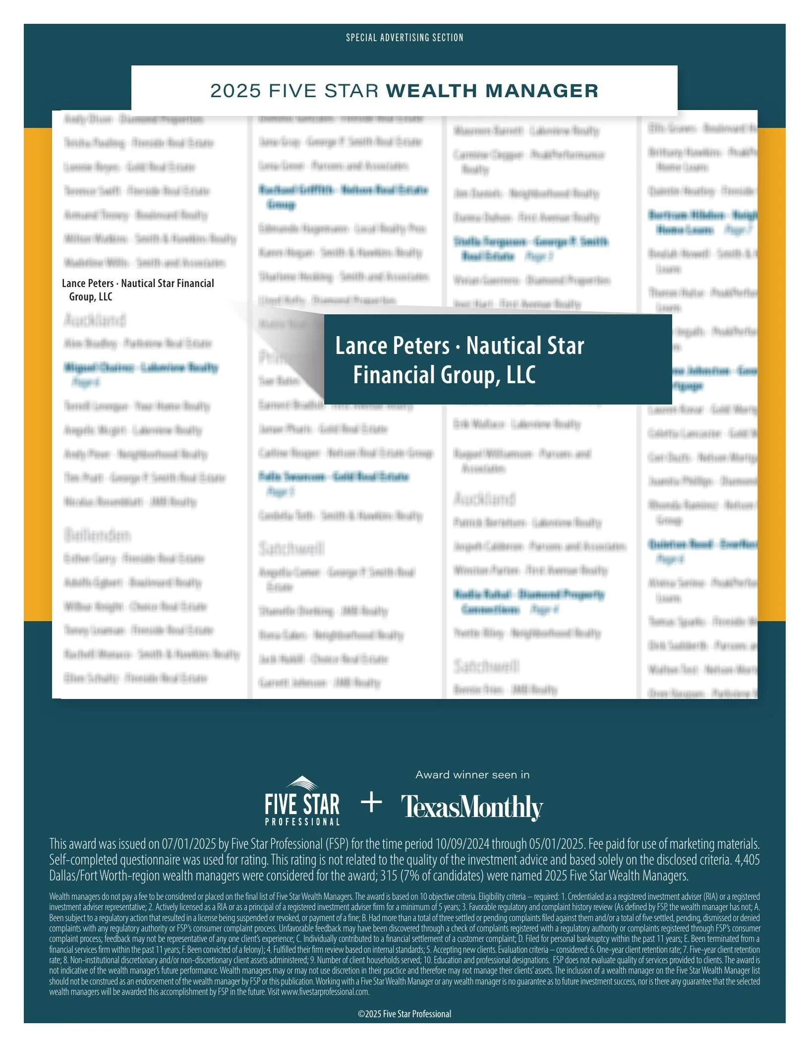 We’re proud to share some exciting news: Lance Peters of Nautical Star Financial Group, LLC has been named a 2025 Five Star Wealth Manager, as featured in Texas Monthly.
